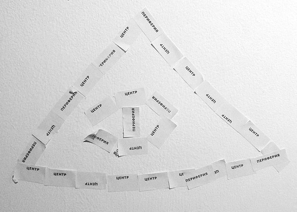 The goal of the project was to reveal the presence or absence of a relationship between the location of the author and his/her work, using an experiment in which the viewer would determine the “residence” of the work and its author by means of stickers marked “center” and “periphery” which were handed out at the entrance. The works of all authors at the time of the exhibition opening were not signed. All subsequent days, after the discussion, the projects were already signed, and the results of the experiment were made public.